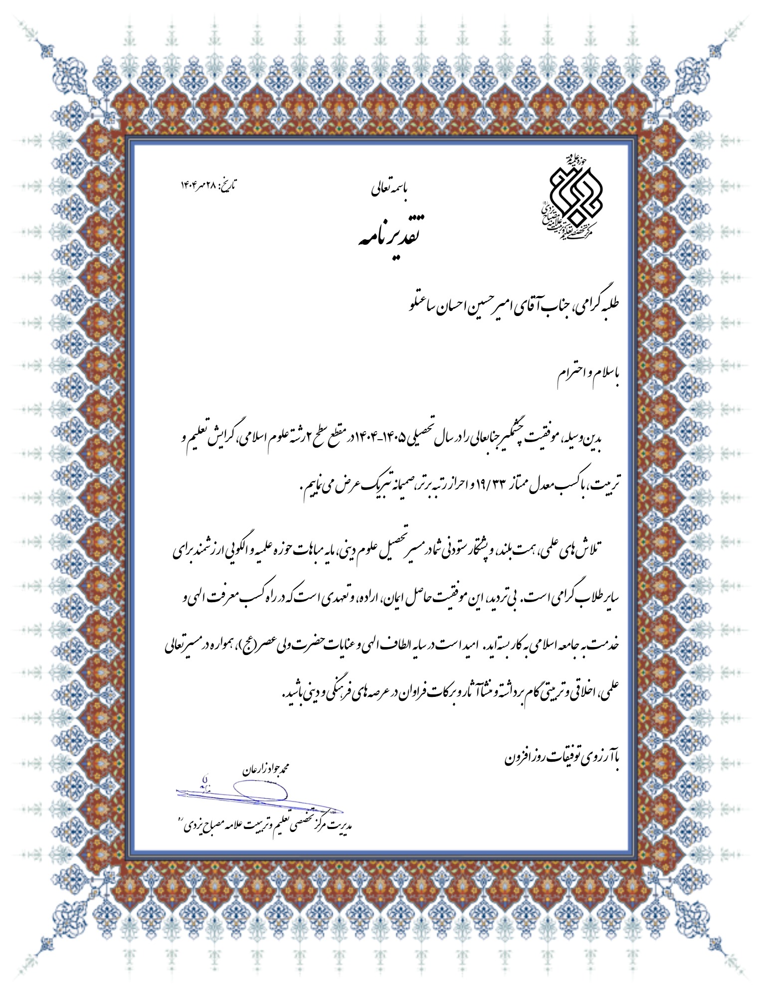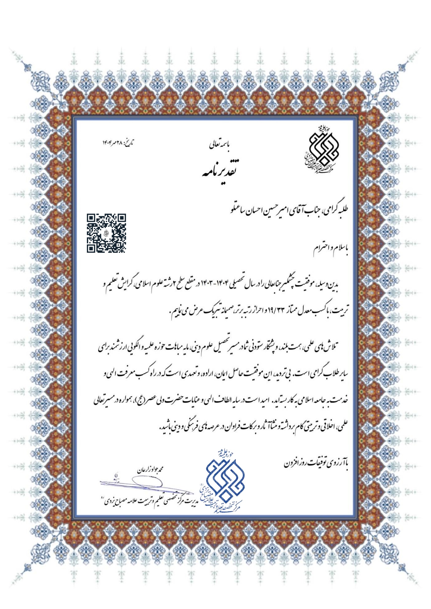 حضرت آیتالله امام خامنهای (مدظله العالی): «اگر ما در داخل حوزه رشته تعلیم و تربیت داشته باشیم، در زمینهی تعلیم و تربیت متخصص تربیت کنیم؛ بحث اخلاق و تعلیم و تربیت در حوزه جدی گرفته شود، آن وقت حوزه علمیه و روحانیت می تواند آموزش و پرورش را عرصه حضور خودش قرار دهد» 1389/8/2