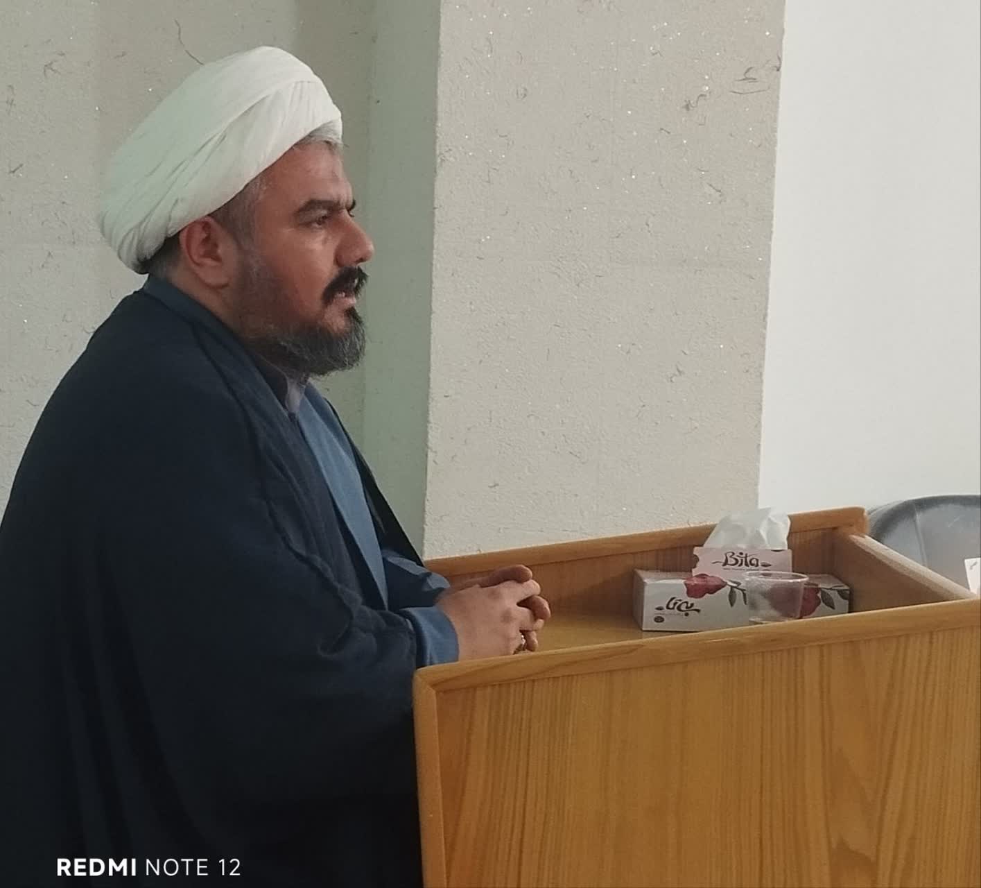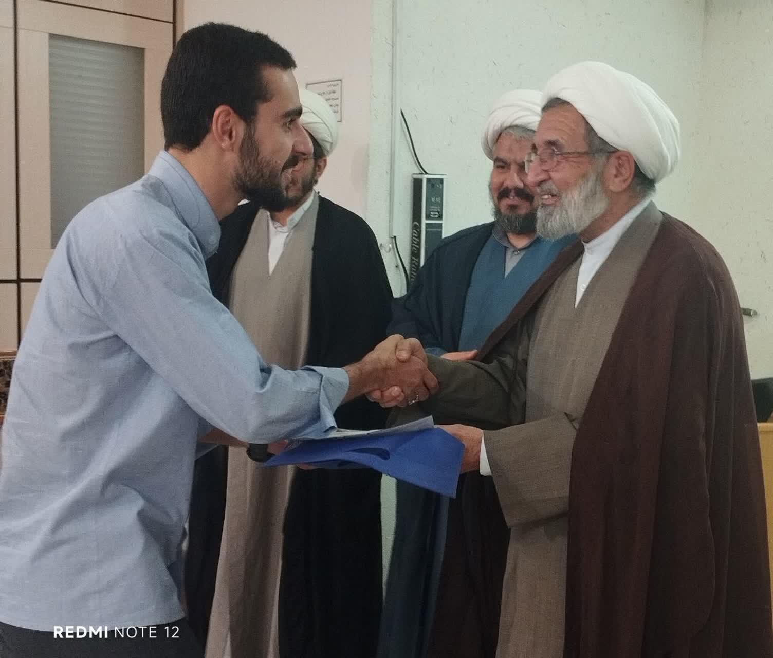 در پایان برنامه این مراسم به پاس زحمات و پشتکار طلبه گرامی جناب آقای امیرحسین احسانساعتلو در سال تحصیلی گذشته و کسب رتبه ممتاز (معدل 19/33) تقدیر به عمل آمد.