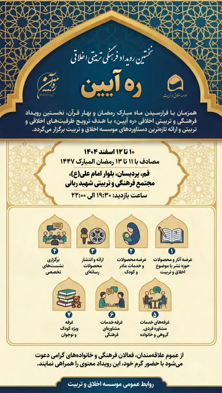 همزمان با فرارسیدن ماه مبارک رمضان و بهار قرآن، نخستین رویداد فرهنگی و تربیتی اخلاقی «راه آیین» با هدف ترویج ظرفیتهای اخلاقی و تربیتی و ارائه تازهترین دستاوردهای موسسه اخلاق و تربیت برگزار میگردد.